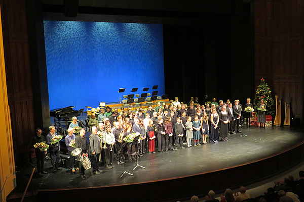 Charmant und wortgewandt führte im Anschluss Ronald Müller, der Dramaturg für Konzert und Musiktheater, durch das facettenreiche Programm des Nachmittags. Im ausverkauften Theater wurde auf eindrucksvolle Weise gezeigt, mit welcher Spielfreude, welchem Engagement und auf welch hohem Niveau Schülerinnen und Schüler an unserer Musikschule lernen. Angefangen bei den Beiträgen der Jüngsten mit Blockflöten, Posaune, Klavier, Harfe und der Geigengruppe „Frisch gestrichen“, über verschiedene kleine Ensembles und Solobeiträge, teilweise sogar vorgetragen von Preisträgern von Landes- und Bundeswettbewerben, bis hin zu den großen Ensembles, dem Nachwuchsorchester, dem Orchester, der Trompetenklasse, den Vokal- Blechbläser- und Percussionsensembles sowie dem Junior Jazz Orchestra wurde alles in einem perfekt geplanten und nahtlos ablaufenden Programm dargeboten.