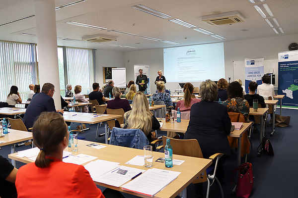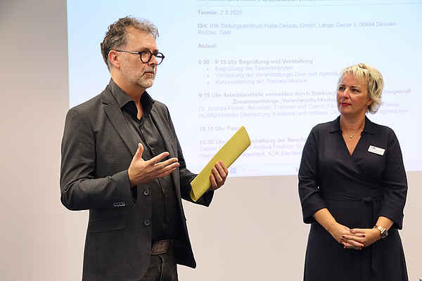 Neben Vertreterinnen und Vertretern von Stadt und Kammern nahmen 20 Unternehmen teil, sodass der Veranstaltungsraum gut gefüllt war. Begrüßt wurden die Teilnehmenden von Stefanie Schmidt-Pforte, Leiterin der IHK-Geschäftsstelle Dessau, und Ingolf Schmidt, Amtsleiter des Amtes für Wirtschaft und Stadtplanung.